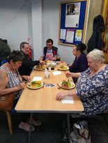 We serve a two-course home cooked lunch, we offer a veggie option and two choices of dessert, with a cuppa for just £4. Our doors open at 10am and lunch is served around 12 noon. Many people come before lunch to sit have a cuppa and a natter or play card or board games. A lot of friendships are formed over lunch, phone numbers shared, and plans made for socialising outside the centre. There’s a real sense of community.
